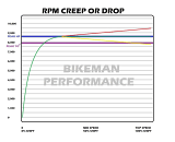 RPM should remain fairly constant on 4 stroke applications and slight creep/rise is okay on 2 strokes since the pipe is heating up and the RPM sweet spot moves slightly. Below is a chart showing RPM creep and RPM drop. Below the chart is a description of what changes to make to control each situation.