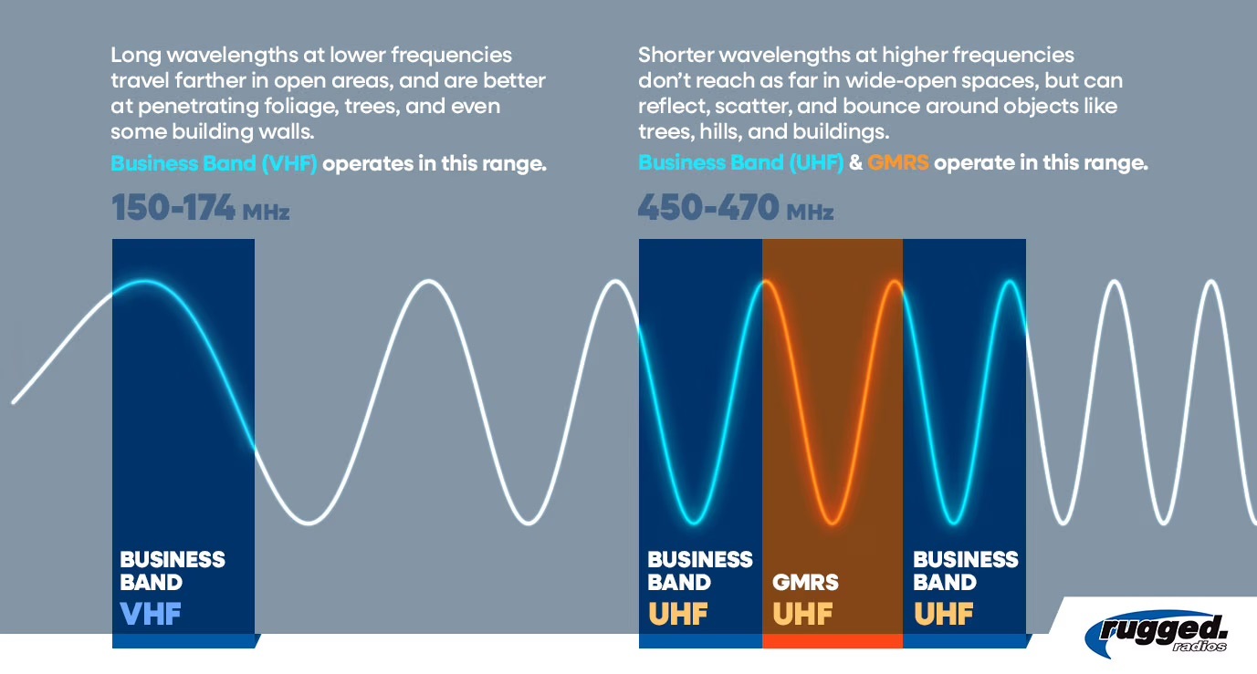 Both GMRS and Business Band can use UHF. Business Band can also use VHF. Knowing the difference helps you match your Rugged system to where you ride.