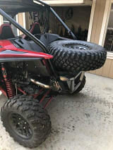 The optional spare tire mount allows you to mount up to a 32" tire flat in the bed or upright. In the upright position the mounting bracket has provisions for attaching a 1.5 gallon Fuelpax (Rotopax) gas can. This bracket can simply be unbolted and removed to lay the tire down flat. The tire is moved as far rearward and low as possible for better vehicle weight distribution and to still allow for storage space at the front of the bed. When designing the spare tire mounting system we thought it was important to think in terms of safety, simplicity, and longevity. That is why there are no moving parts, no gas struts to wear out, no latchs to rattle, and no joints to loosen up. The tire is mounted down low to keep the center of gravity as low as possible. All spare tire mounting components have a powder coated matte black finish. All hardware needed is included.