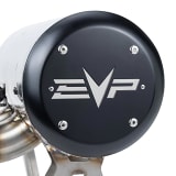 The muffler’s twin exit design can be finished off in multiple interchangeable tip configurations. Additional styling features include a black powder-coated muffler end cap with laser-etched EVP logo set off by a riveted raw aluminum backing plate.