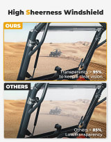 Made from 1/4" thick polycarbonate, our windshield stands up to impacts much better than glass—250 times better. Anti-vibration rubber pads add to their snug fit on your UTV, softening the bumps of rough trails.