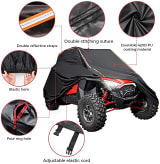 Kemimoto’s UTV cover features double-stitched seams, an adjustable elastic cord, and a flexible design compatible with RZR models, ensuring a secure fit even on windy days. It includes two reflective strips on each side for enhanced visibility in low light, helping others see the vehicle and preventing scratches from passersby. The cover is easy to install and remove, offering convenient protection for your UTV.