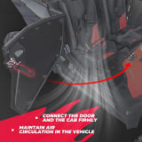 - Hook the hook of UTV door latches to the cab. Click the hole of the door latches into the vehicle door latches. Quickly complete the installation without tool.