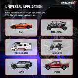 Light up your golf cart like never before with the MadJax Universal LUX Underglow Kit and its expansion options. Designed for ultimate visibility and style, this premium LED lighting system offers Bluetooth control, weather-resistant construction, and bold RGB color customization. Whether you’re enhancing the frame or the roofline—or expanding an existing system—MadJax LUX kits deliver brilliant performance for nighttime rides and showstopping looks.