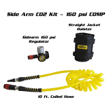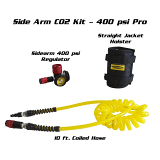 Sidearm CO2 Kit from Power Tank. Here's the Sidearm Kit featuring our Sidearm regulator without the CO2 bottles. The Straight Jacket Bottle Sleeve fits 16 or 20 oz. CO2 bottles with 323 On/Off valves. Includes an aluminum valve protector and a carabiner to hang the holster along with a 10 ft. Coiled SuperFlex Hose.