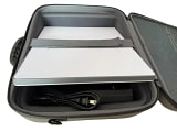 Interior compartments keep cables, adapters, and chargers neatly arranged and easily accessible.