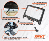 - Folding Glass Windshield (RBO4181) – DOT-approved laminated glass with a manual wiper, sliding vents, and easy-fold mechanism.