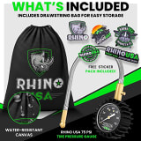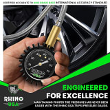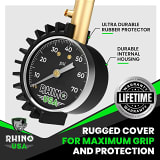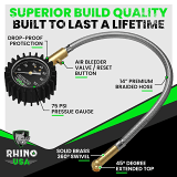 The Rhino USA 75 PSI Tire Pressure Gauge ensures precise tire maintenance with ANSI-certified accuracy and a 2” glow-in-the-dark dial for low-light readability. Built with solid brass hardware, a premium braided hose, and a 360° swivel chuck, this rugged tool simplifies pressure checks on cars, trucks, motorcycles, and more. The ergonomic grip and compact design, paired with a heavy-duty storage bag, make it ideal for professionals and DIY enthusiasts. Crafted by a family-owned business, it guarantees durability and reliability for optimal driving safety.