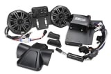 A compact audio system that mounts to the front fairing, stylized to match factory designs and doubles as a windscreen. Featuring fullsize sound in a compact package with 2-full range 4" speakers.