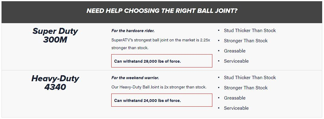 We got the strongest steel stud material we could get our hands on — hardened and black oxide coated 300M. Then we used it to make a stud that doesn’t narrow as much as stock. The result is a ball joint that’s 2.25x stronger than your OEM ball joint. If you want to work hard and play harder with ultimate strength, you need SuperATV’s super duty 300M ball joint.