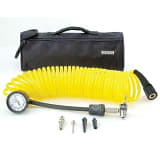 Coil Hose with inline inflator/deflator pressure gauge, 3-piece inflation tips kit, quick connect stud, and storage bag. (25ft. hose rated to 200 PSI) For use with 300P and larger portable compressors and H model compressors.